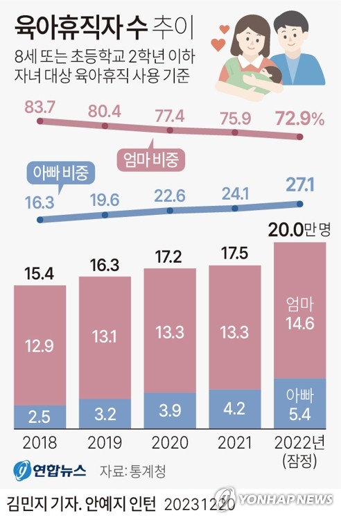 지난해 육아휴직자가 20만 명에 육박하면서 역대 최대를 기록했다. 특히 육아휴직을 한 아빠가 대거 늘었다. 다만 남성 육아휴직자의 70%는 종업원 수 300명 이상 기업 소속으로, 대기업 쏠림은 여