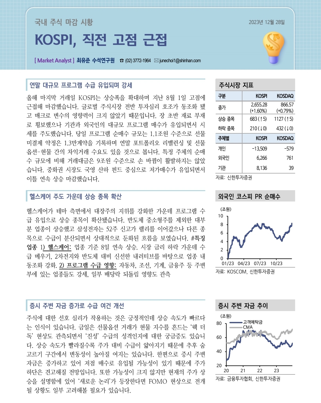 - 올해 마지막 거래일 KOSPI는 상승폭을 확대하며 지난 8월 1일 고점에 근접해 마감했습니다.