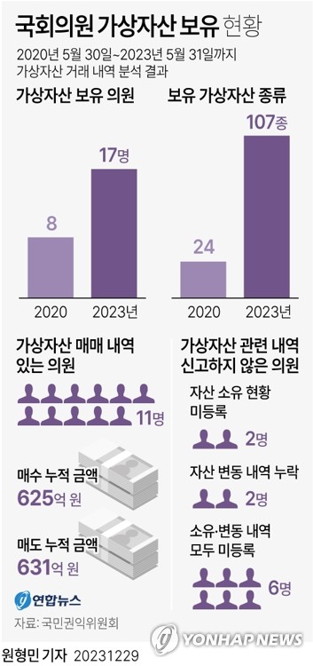 (서울=연합뉴스) 곽민서 기자 = 최근 3년간 국회의원들이 거래한 가상자산(코인) 규모가 600억원을 넘은 것으로 나타났다.