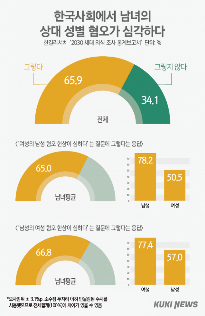 청년들이 한국 사회에 남성과 여성의 상대 성별에 대한 혐오(여성 혐오, 남성 혐오)가 ‘심각’한 수준이라고 평가했다. 여성 혐오(여혐)와 남성 혐오(남혐)가 젠더 갈등, 결혼 인식 등에도 영향
