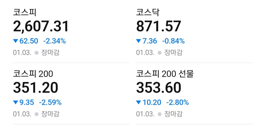 2. KOSPI -2.3%, KOSDAQ -0.8%로 KOSDAQ은 YTD 상승 유지, KOSPI는 어제 오른 것보다 더 많이 빠지며 2,600선 회귀.