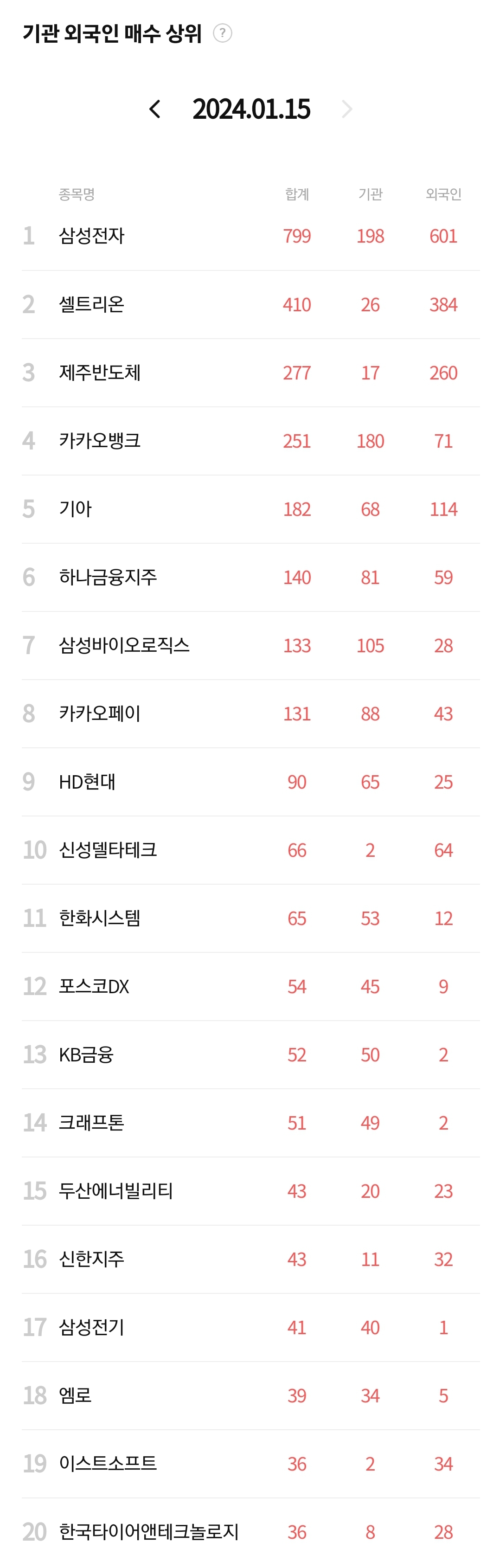외국인/기관 순매수 상위 5종목
