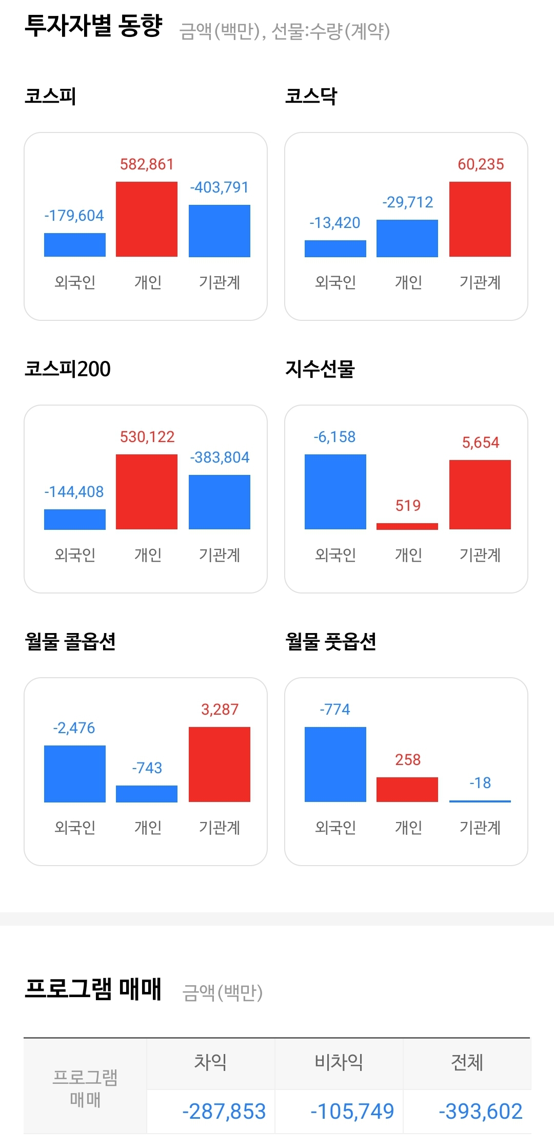 외국인은 오늘 선물 -5,190억원 순매도로 금융투자 +7,474억원 순매수를 유도, 선물을 매수한 금융투자는 KOSPI 현물 -2,879억원 순매도.