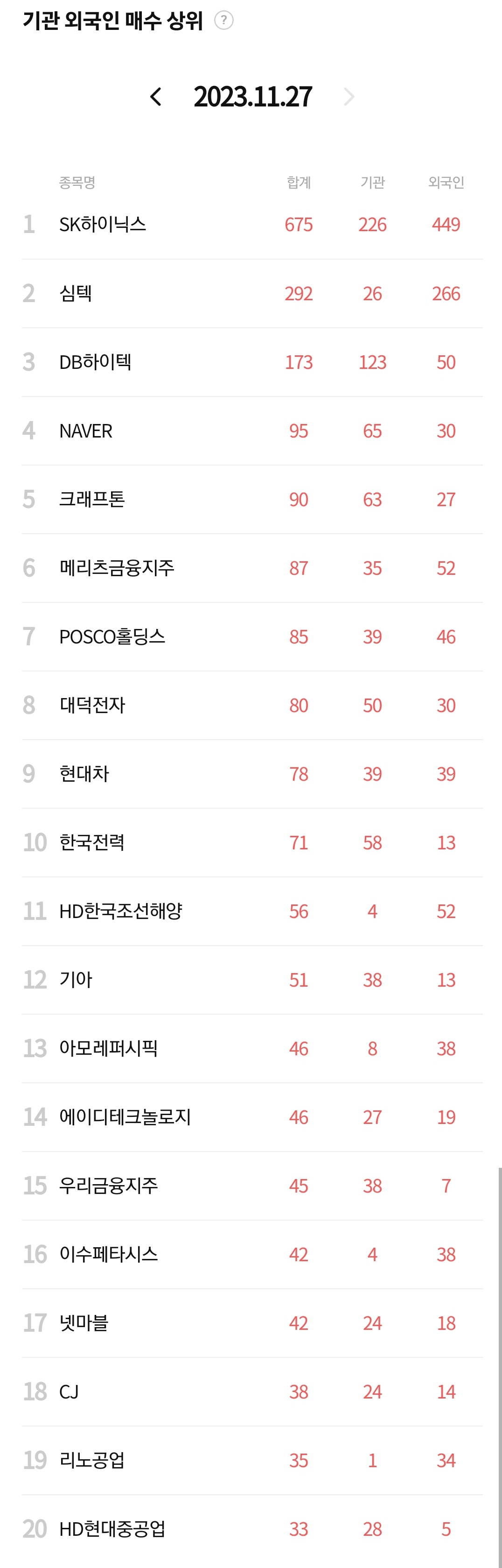 11월 27일 장중 외국인/기관 순매수 상위 5종목