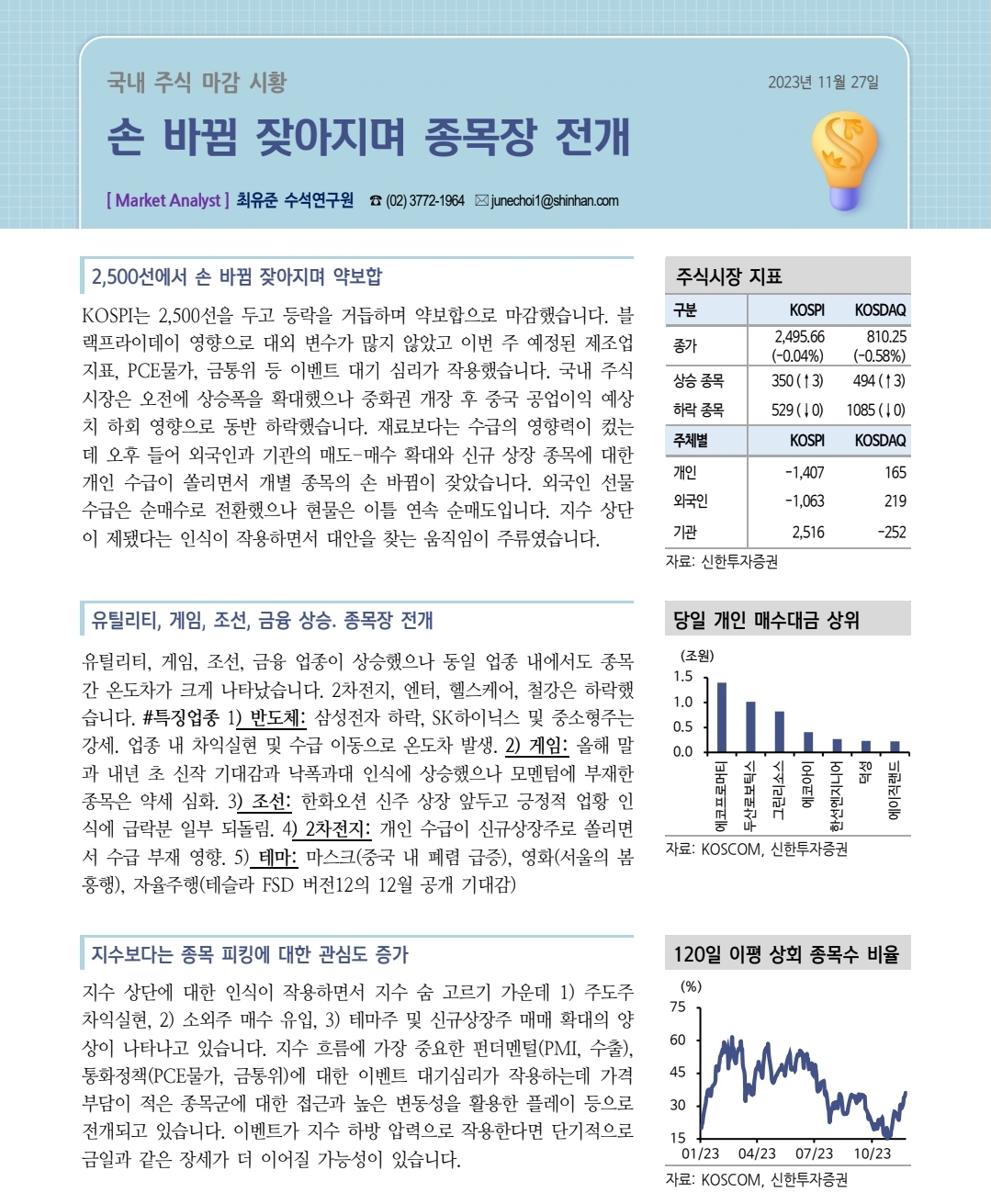 - 유틸리티, 게임, 조선, 금융 업종이 상승했으나 동일 업종 내에서도 종목간 온도차가 크게 나타났습니다.