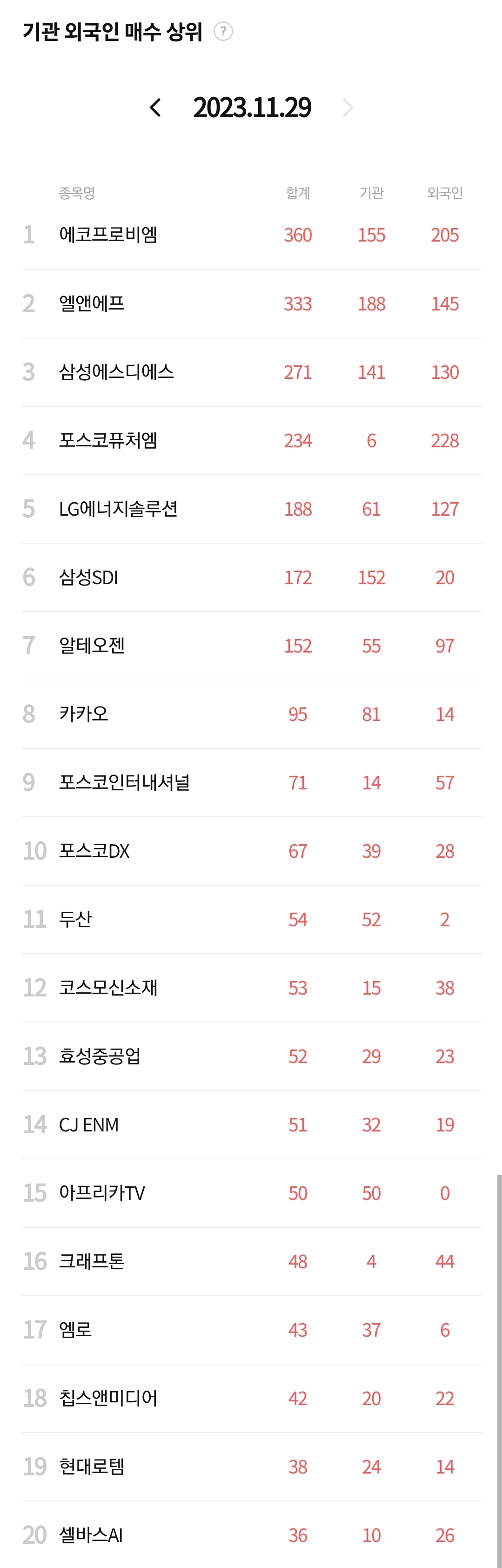 28. 에코프로비엠(10.22%) : 테슬라 사이버 트럭 출시를 앞둔 기대감 등에 2차전지 테마 상승 속 급등