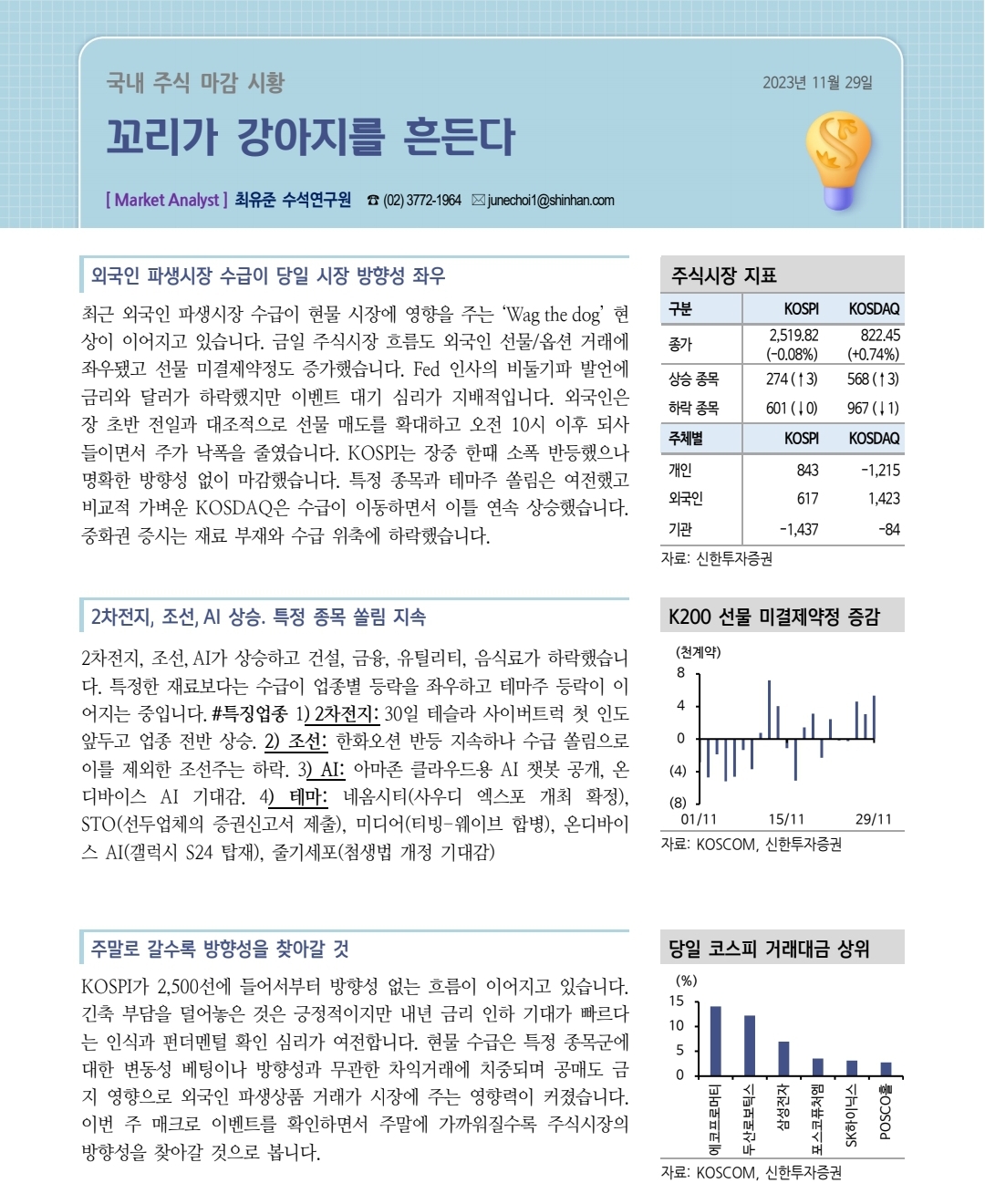 - 현물 수급은 특정 종목군에 대한 변동성 베팅이나 방향성과 무관한 차익거래에 치중되며 공매도 금지 영향으로 외국인 파생상품 거래가 시장에 주는 영향력이 커졌습니다.