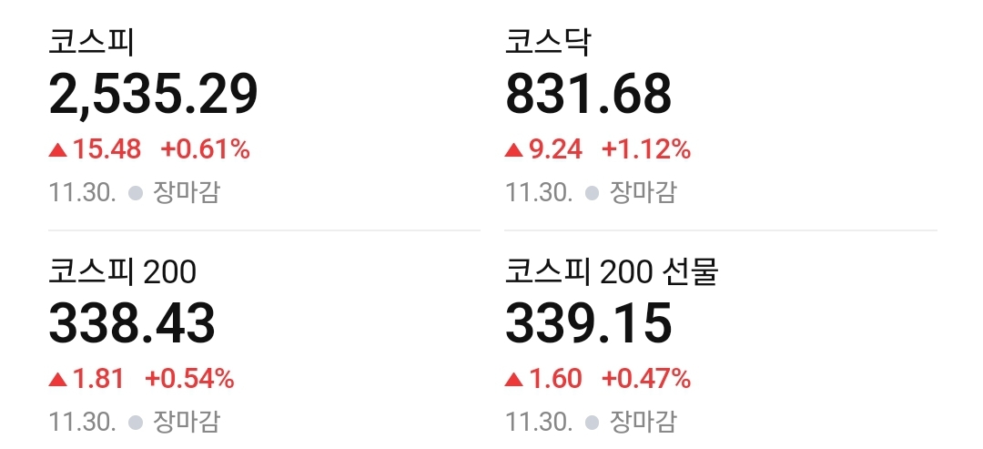 - KOSPI와 KOSDAQ 지수는 11월 각각 +11%, +13%.