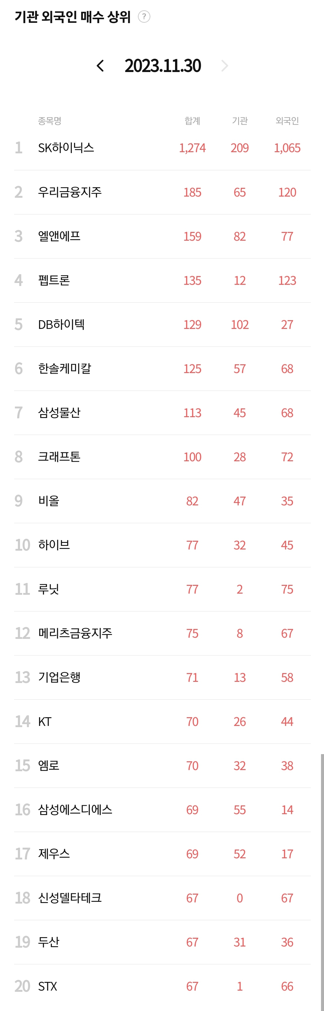 - 기관 Bottom 10: 에코프로머티, 셀트리온헬스케어, SK하이닉스, 셀트리온, 호텔신라, 한국항공우주, 파두, 에코아이, 에스엠, 농심