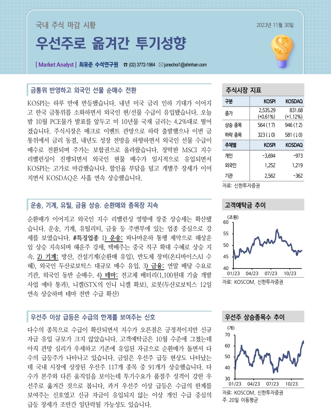 - 금일은 우선주 급등 현상도 나타났는데 국내 시장에 상장된 우선주 117개 종목 중 91개가 상승했습니다.