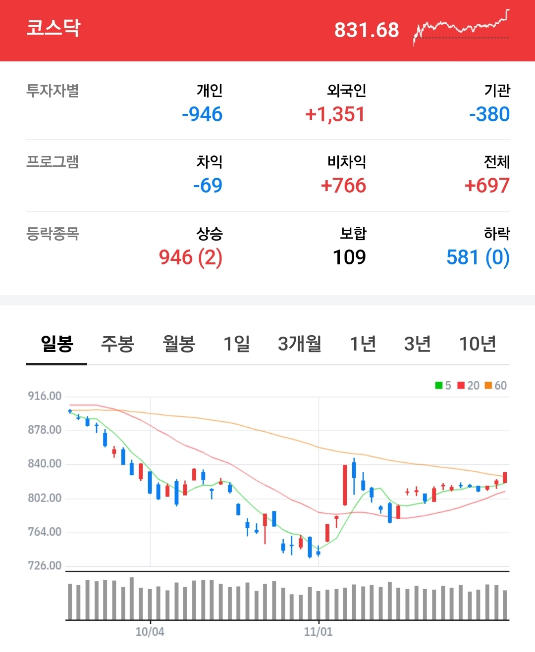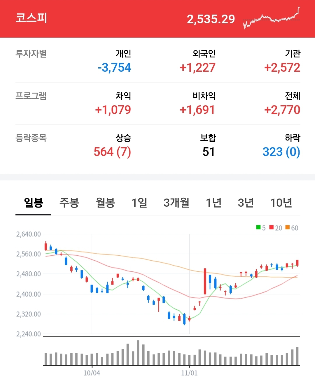 - KOSDAQ은 10월 초의 832pt까지 회복, KOSPI는 10월 내내 2,500 밑이었음을 고려하면 이를 넘어서는 강한 반등으로 2,535pt 도달.