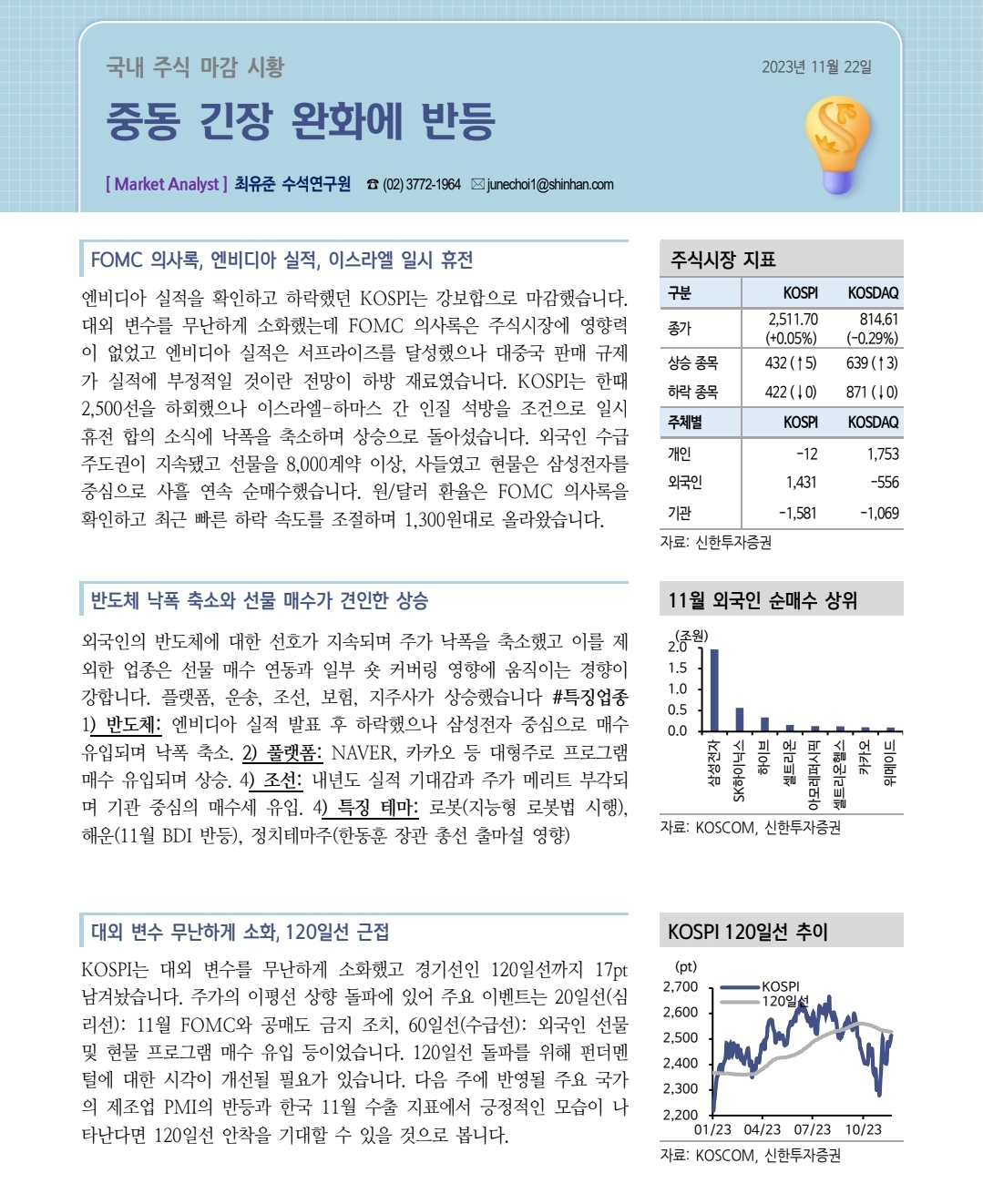 - KOSPI는 한때 2,500선을 하회했으나 이스라엘-하마스 간 인질 석방을 조건으로 일시휴전 합의 소식에 낙폭을 축소하며 상승으로 돌아섰습니다.