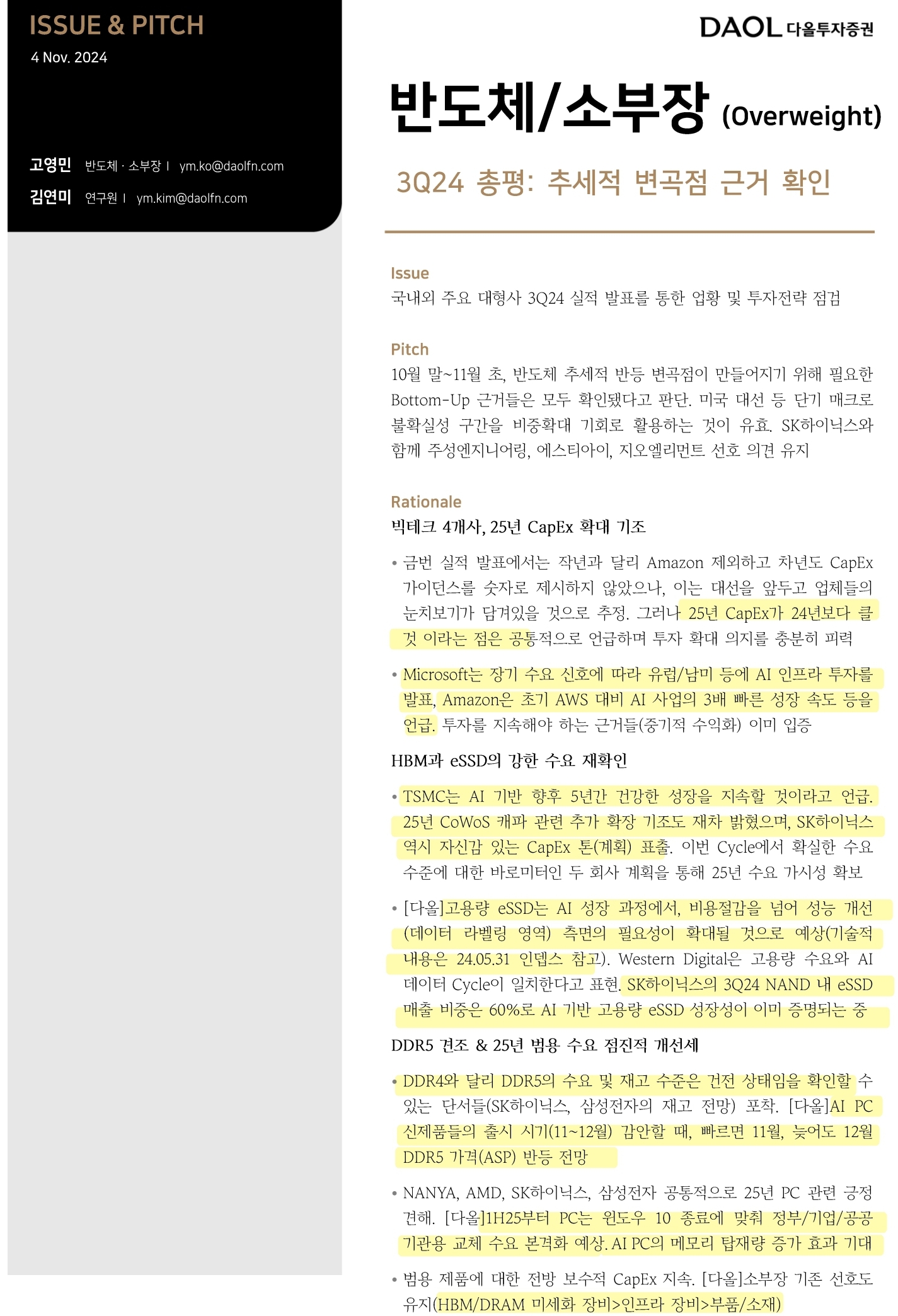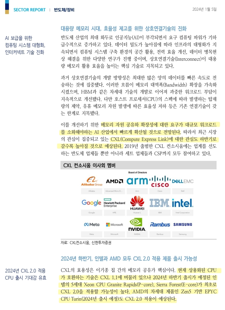 대용량 메모리 시대, 효율성 제고를 위한 상호연결기술의 진화 AI 보급을 위한 컴퓨팅 시스템 대형화, 인터커넥트 기술 진화 2024년 하반기, 인텔과 AMD 모두 CXL 2.0 적용 제품 출시 가능성 2024년 CXL 2.0 적용 CPU 출시 기대감 유효DRAM 3사 모두 제품 개발 완료 Co-processor 및 부품 업종 낙수 효과도 동반될 것으로 기대 FPGA, ASIC 활용한컨트롤러, 스위치 등 낙수 효과 기대 시스템의 핵심 구성 요소로 프리미엄 PCB, CXL 컨트롤러와 CXL 스위치, CXL 적용 DRAM이 신규 시장 개화의 수혜를 누릴 것으로 기대된다. CXL DRAM은 전체 CXL 관련 시장(CPU 제외)에서 80% 이상의 매출 점유율을 기록할 것으로 전망되며, 프리미엄 PCB, CXL 스..